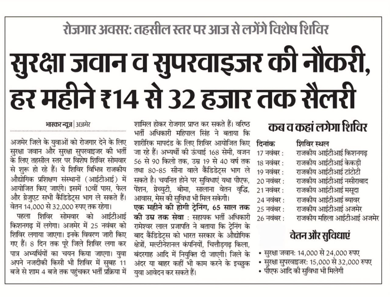 राजस्थान के युवाओं के लिए यह सिक्योरिटी गार्ड और सुपरवाइजर की सीधी भर्ती एक बेहतरीन अवसर है, जिसमें बिना किसी लिखित परीक्षा के अच्छी सैलरी और सुविधाओं के साथ 65 साल की उम्र तक नौकरी पाने का मौका मिल रहा है। चूंकि यह भर्ती शिविर कुछ ही दिनों के लिए अजमेर जिले की तहसीलों में आयोजित किया जा रहा है, इसलिए योग्य और इच्छुक उम्मीदवार समय पर अपने सभी आवश्यक दस्तावेजों के साथ निर्धारित स्थान पर उपस्थित होकर इस मौके का फायदा उठाएं।