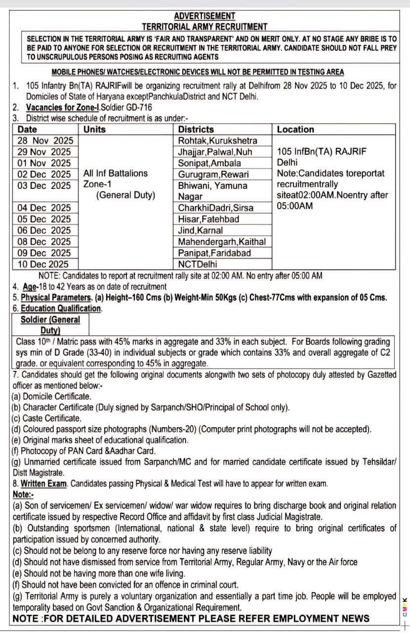 Territorial Army Recruitment Rally 2025 Vacancy Details